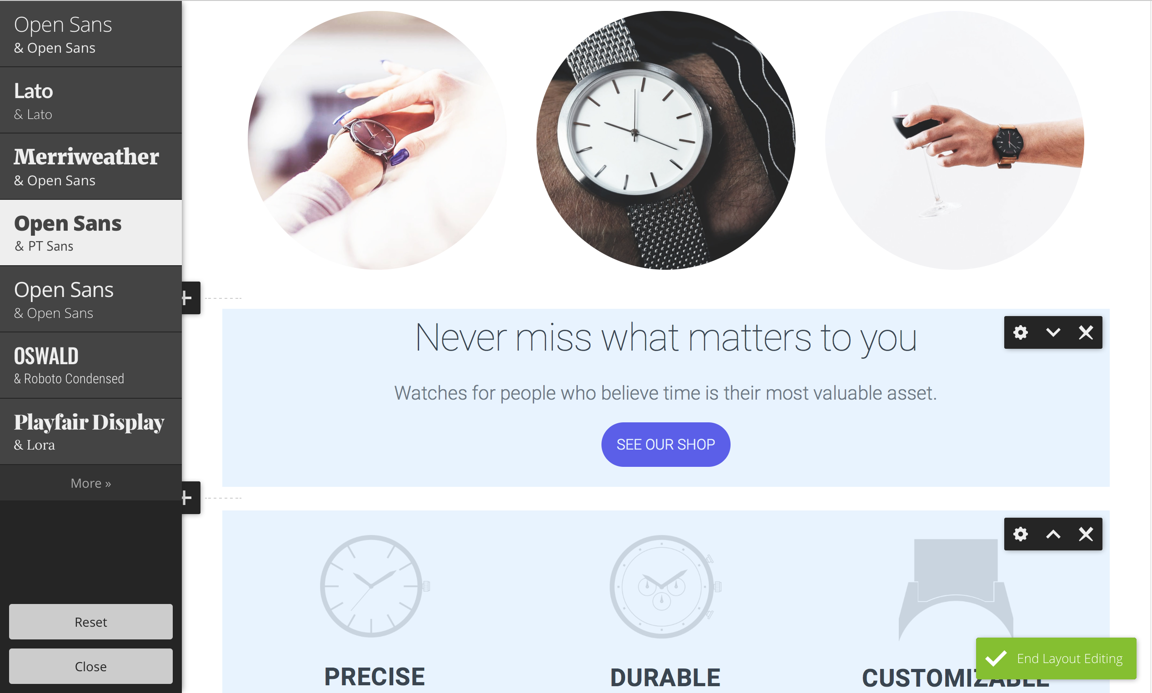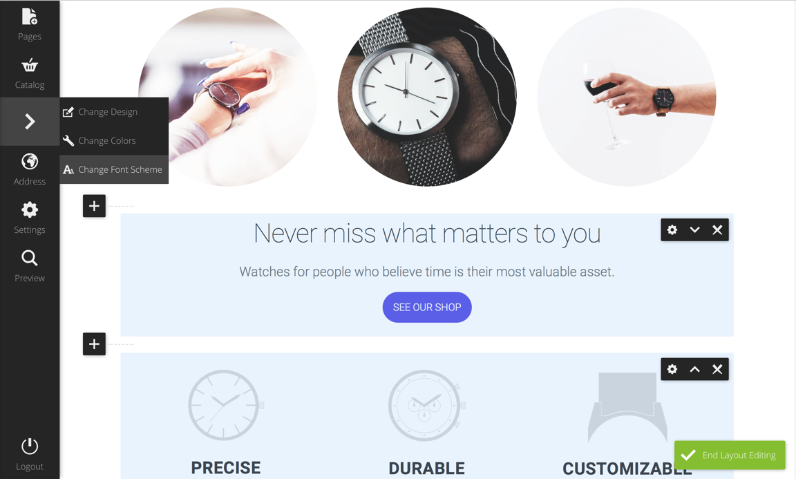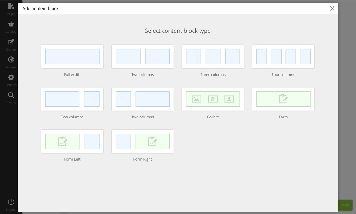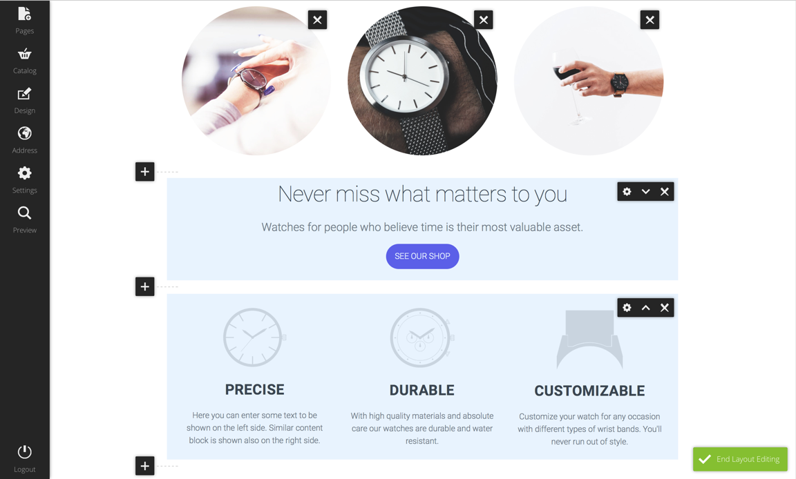 “Change Layout” gives you the option to choose ready made design layouts, but the “Edit Layout” button activates the new feature for adjusting your layout to your liking. Add new content blocks, move them around, delete them, put in a gallery, a contact form. See examples below.